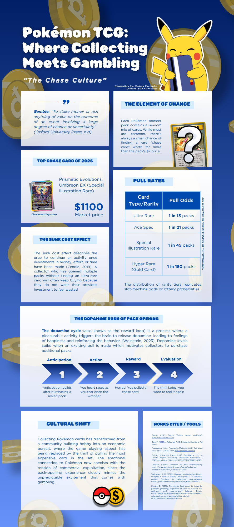 After creating my own, I have begun to truly appreciate infographics as a medium for conveying information and simplifying nuanced topics in ways that are easy to understand for those who may not have high levels of data literacy. Additionally, this process made me consider how design reflects cultural context, as familiar Pokémon imagery and colors influence how fans and collectors interpret information. As a student who enjoys incorporating creativity into my academic work, I feel that visualizations as a method of learning are no less effective than scholarly articles or research papers.